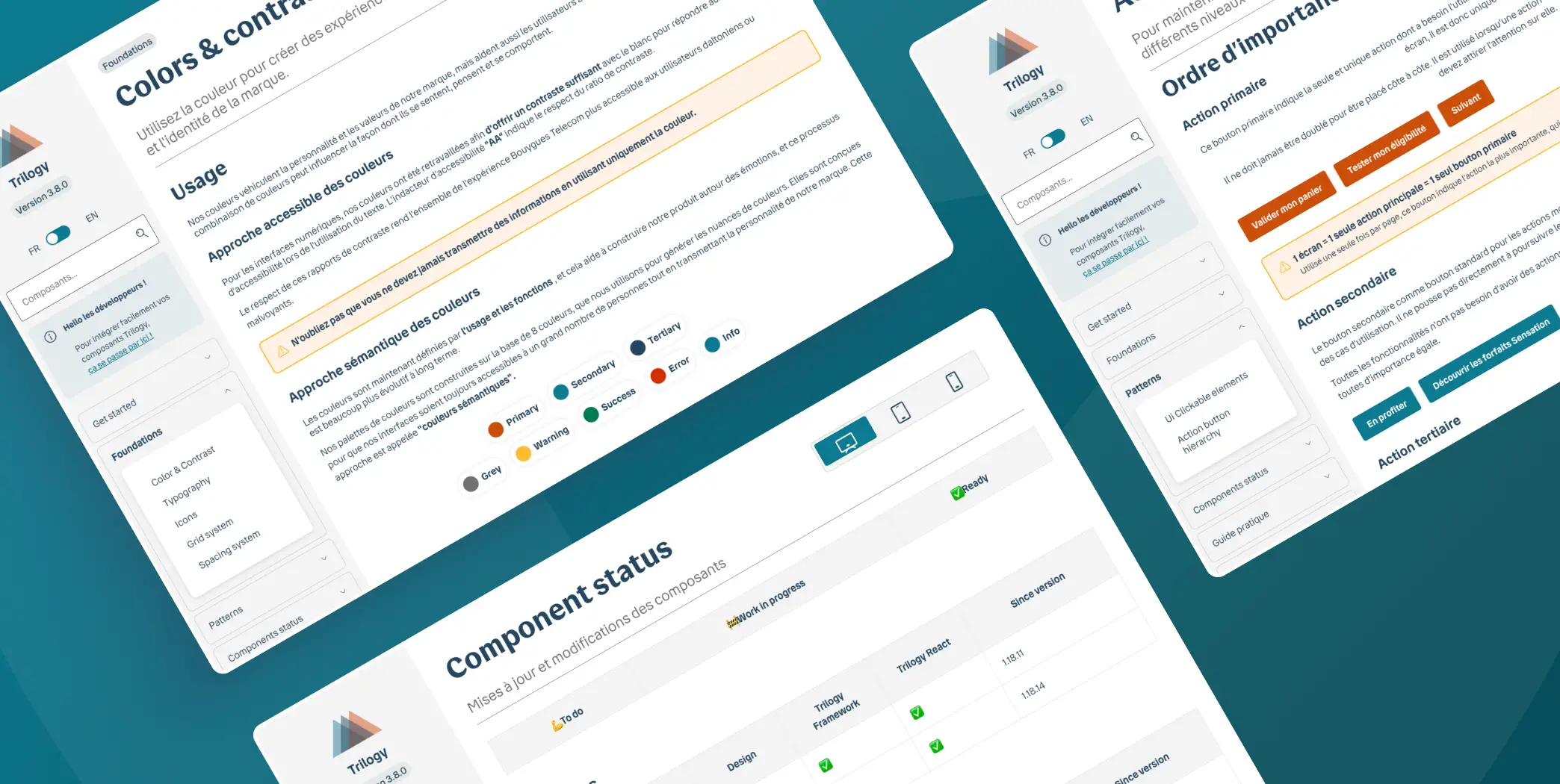 Le rapport d'étonnement a posé les bases d'une stratégie claire : consolider avant d'étendre. Une recommandation qui a guidé toute la mission et permis de construire un système vraiment solide. Aujourd'hui, Trilogy est un produit à part entière : Design System de référence de Bouygues Telecom, documentation en ligne comme source unique de vérité, cohérence graphique et technique garantie sur l'ensemble des interfaces. Un système vivant, adopté par toutes les équipes, qui continue de s'enrichir et d'évoluer dans la durée.